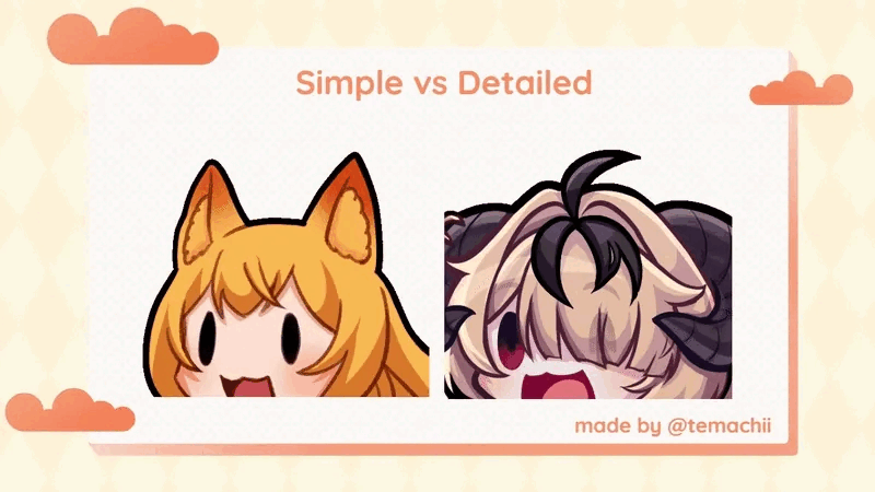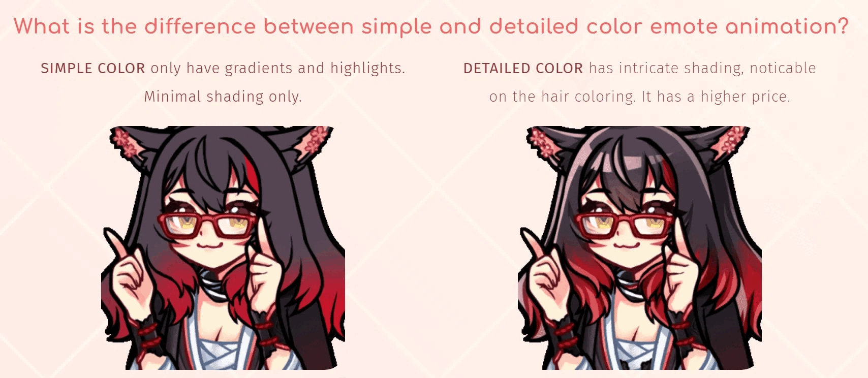 Coloring and animation options: SIMPLE, and DETAILED. This will determine the price range for each emote.