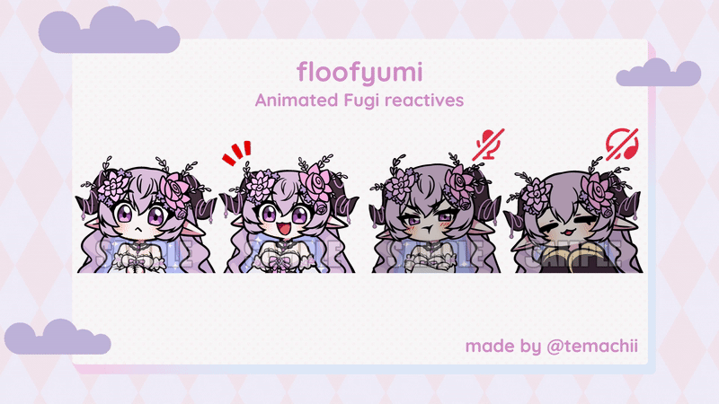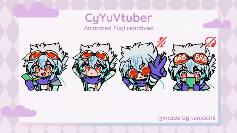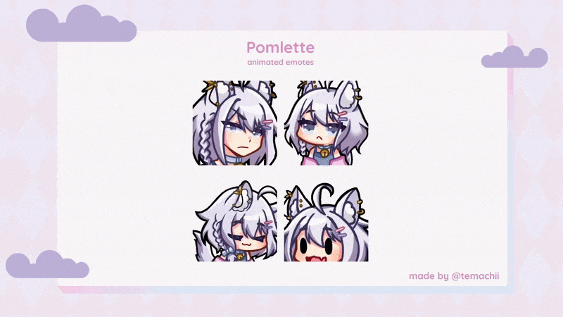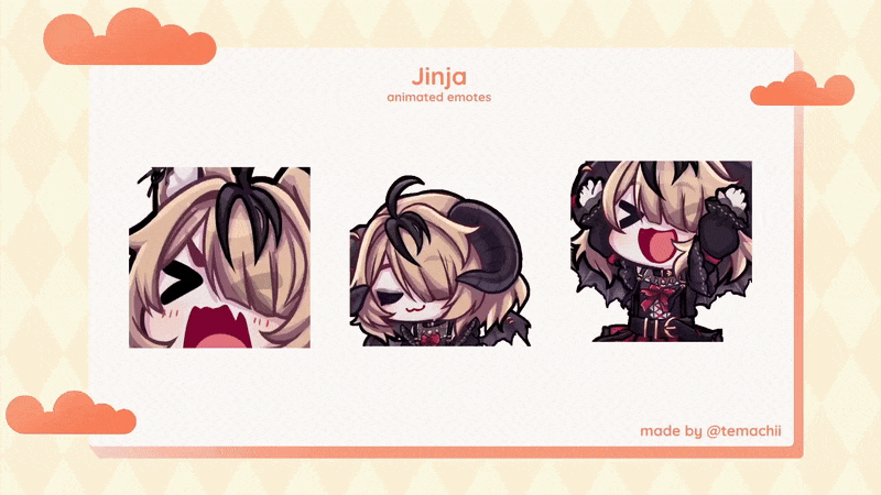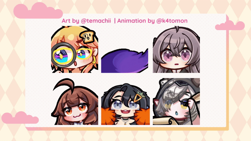 NOTE: My animated emotes are hand-drawn and frame-by-frame. Collab emotes with Kato are drawn by me, and he animates them in Live2D.